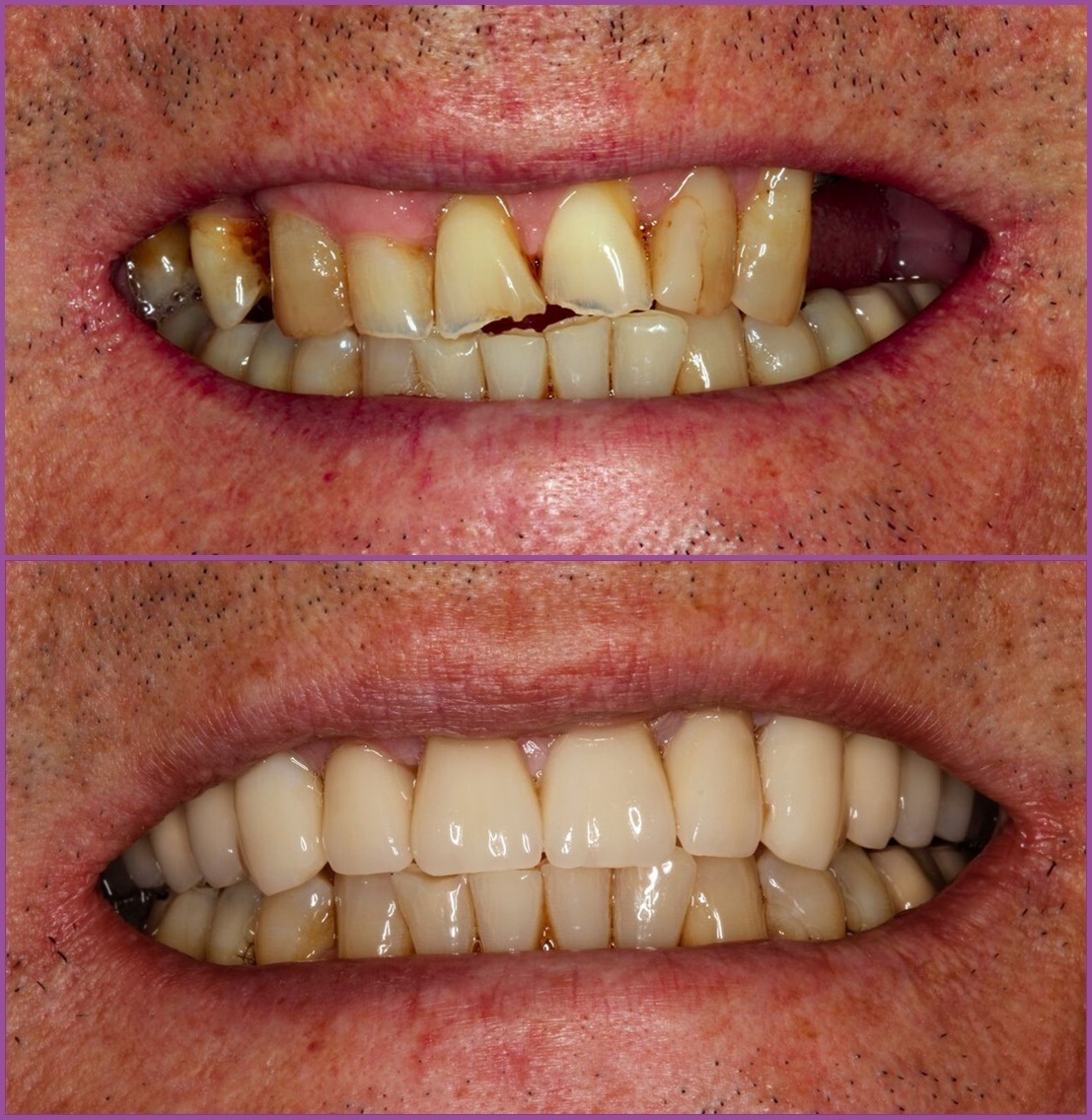 Páciensünk felső állcsontja teljes rehabilitációra szorult. A bal oldalon a kis-és nagyőrlői hiányoztak, a jobb oldalon viszont ún. sorközi foghiányai voltak (ilyenkor fogak határolják elölről és hátulról is a foghiányt). A fogak esztétikáján rontott a fogkő, az elszíneződött régi tömések és a kezdődő saverózió miatti egyenetlen fogélek.