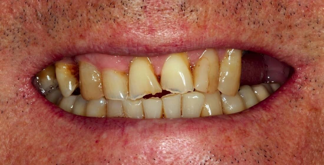 Páciensünk felső állcsontja teljes rehabilitációra szorult. A bal oldalon a kis-és nagyőrlői hiányoztak, a jobb oldalon viszont ún. sorközi foghiányai voltak (ilyenkor fogak határolják elölről és hátulról is a foghiányt). A fogak esztétikáján rontott a fogkő, az elszíneződött régi tömések és a kezdődő saverózió miatti egyenetlen fogélek.
