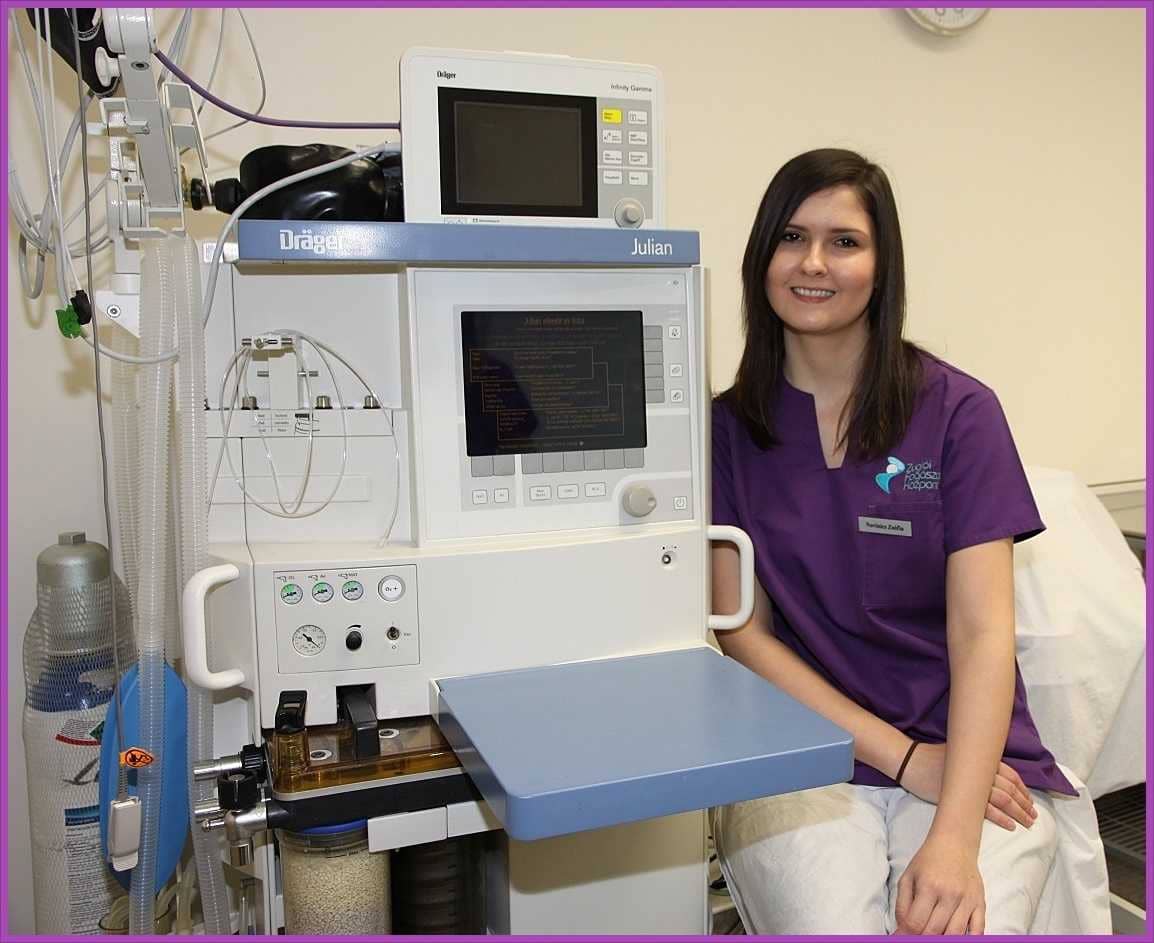 (Egy ilyen altatógép látható képünkön, valamint Novinics Zsófia műtőfelelősünk.)