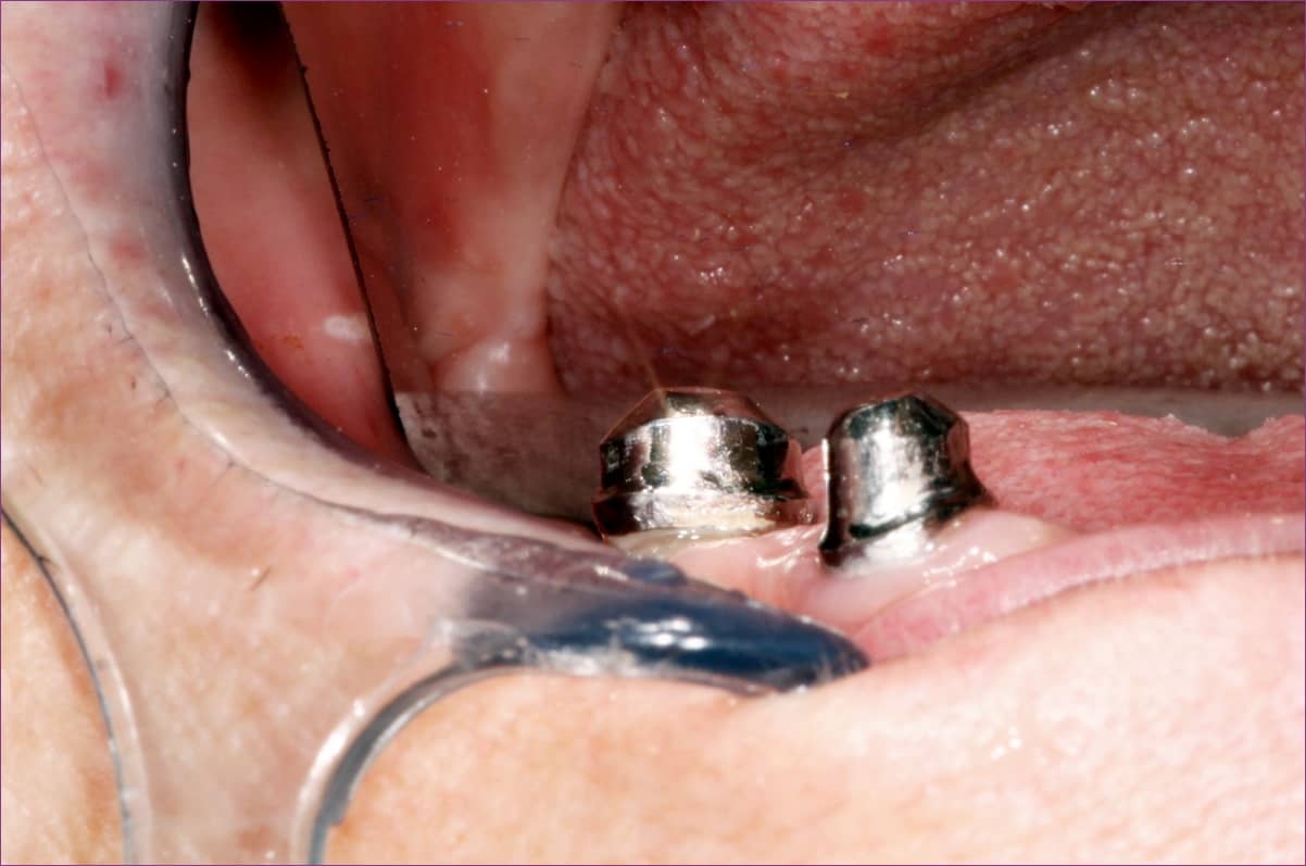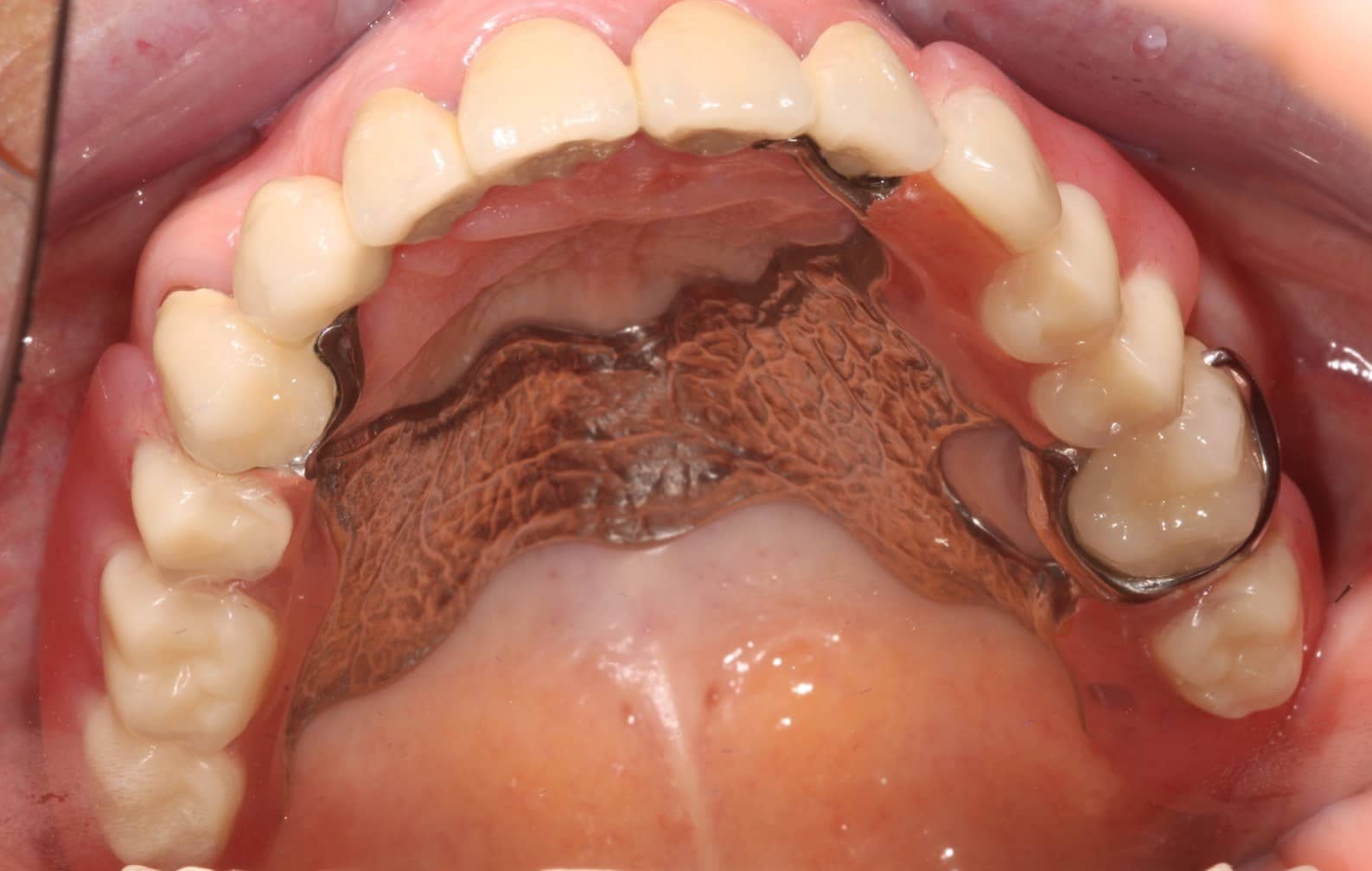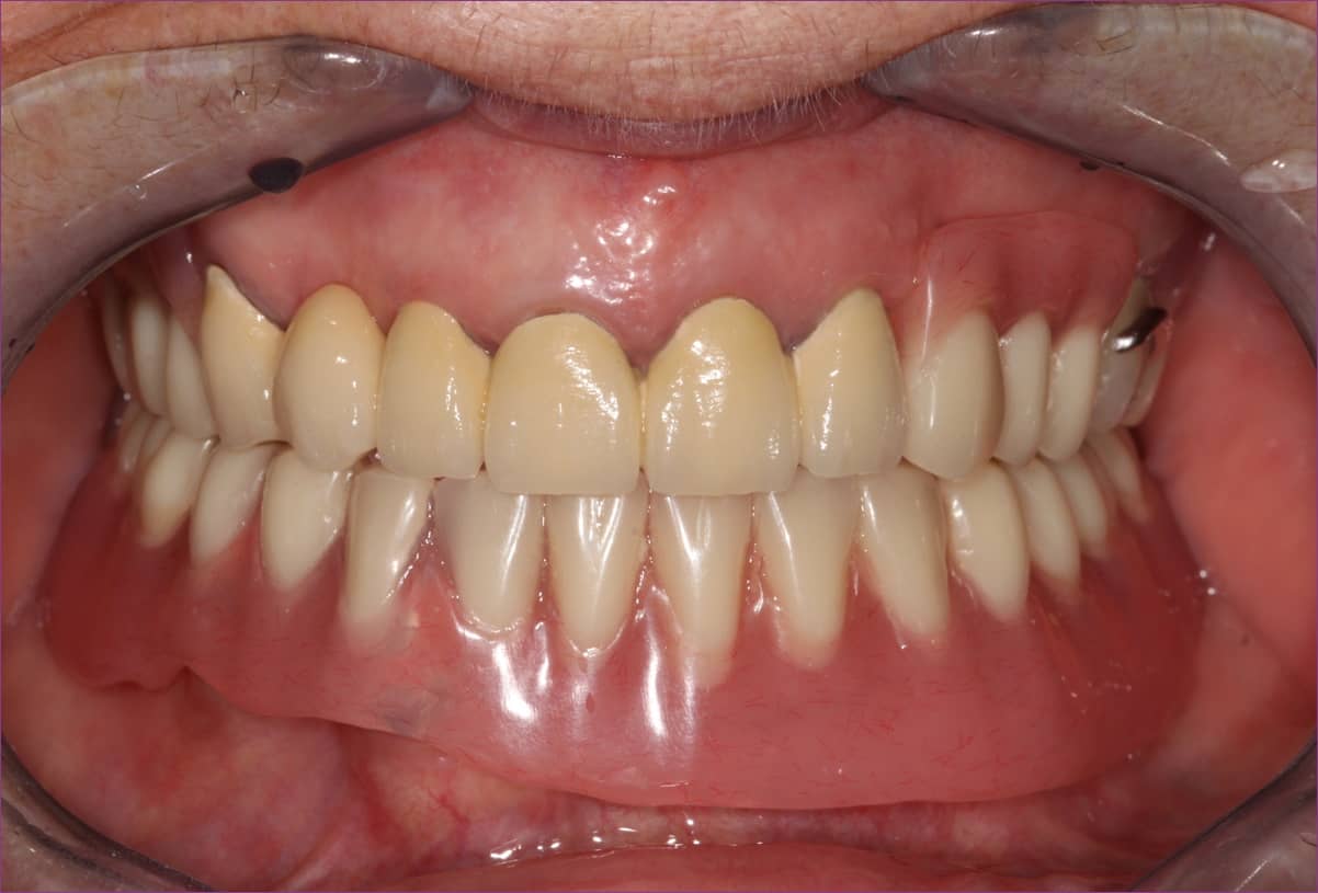 Az alsó állcsontra pedig cilindrokónuszos-teleszkóp elhorgonyzású fogpótlás lett a megoldás, az alábbi kép az SB5 primer teleszkópok beragasztása utáni állapotot mutatja.