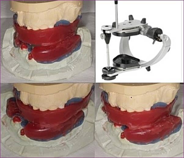 A szakorvos a helyreállító kezelés során egy speciális szerkezet, a Protar 5 típusú egyéni artikulátor segítségével elemezte a páciens harapását, hogy az elkészült pótlásokkal a hölgy állkapocsízülete számára megteremtse az optimális körülményeket. (A képen a berendezés körül a megfelelő pozícióban – propulsio, leteropulsio – rögzített harapási sablonok láthatók.)