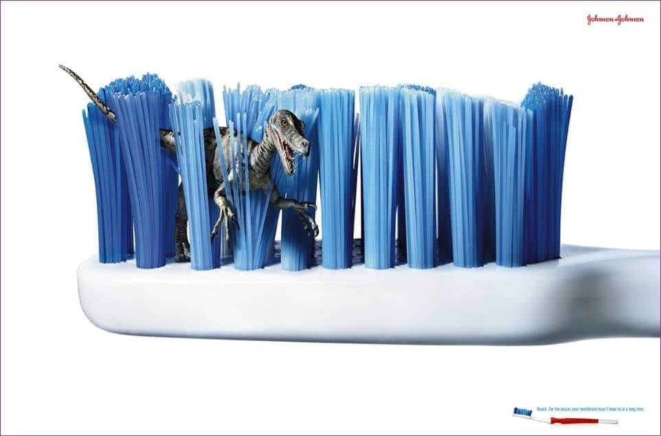 Ez a fogkefereklám például azt ígéri, hogy a kefe olyan helyekre is eljut a fogak között, ahol az előző fogkefék már nagyon régen jártak. A dínó igen jó választás volt ennek az üzenetnek a szemléltetésére!