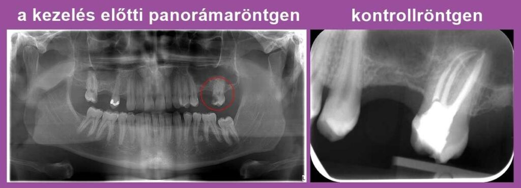 A kontroll röntgenfelvételen jól kivehető, hogy a fognak elöl nem egy, hanem két gyökere van: ha ezt nem sikerül megtalálnunk és letömnünk, az később panaszokat és gócos tüneteket okozhat.