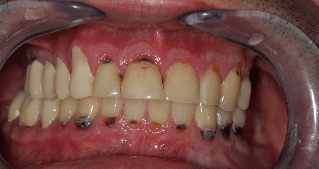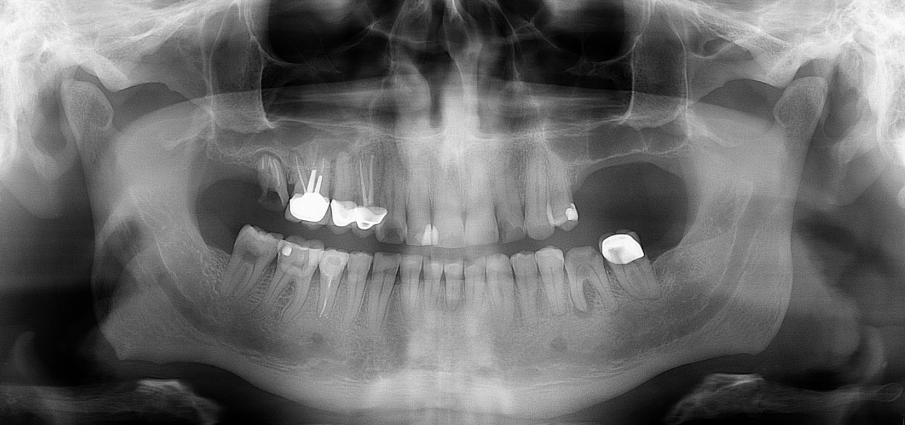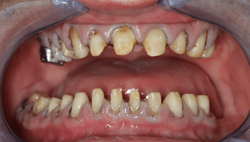 Klinikai és radiológiai vizsgálatok alapján megállapítottam, hogy a túlterhelés (parafunkciók) jelei látszódnak a fogain is: abfrakciók – nyaki kopások és attríciók –, rágófelszíni kopások is kifejezettek voltak. Harapása igen bizonytalan tartományban mozgott, nem volt egy stabil helyzet, amelybe határozottan össze tudott volna zárni (csak kereste a megfelelő pozíciót.) TMI-vizsgálat során reciprok crepitációt (kattanás nyitáskor-záráskor is), myofascialis eltéréseket (hypertrófiás musculus masseter – túlterhelt rágóizom) és beszűkült mozgáspályákat találtam. Emellett sajnos a nem megfelelő szájhigiénés szokások miatt a fognyakak „sérült” részein szuvasodások is megjelentek, illetve a bal alsó hatos és a jobb felső hetes fog már oly mértékben destruálódott, hogy el kellett távolítani őket.