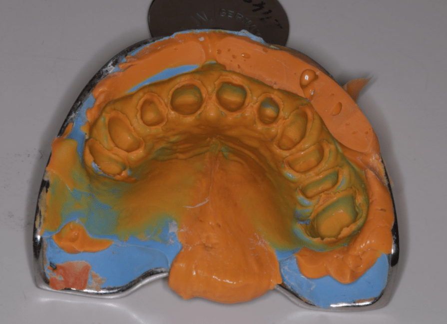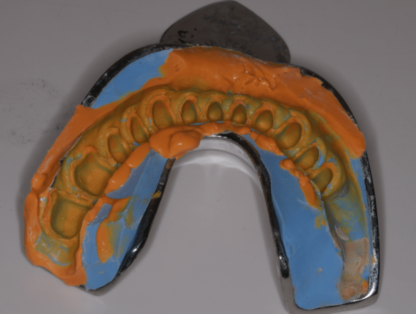 Első lépésként előkészítettem a fogakat a pótláshoz (szuvas léziók eltávolítása, csonkkiegészítések kompozit tömőanyaggal, csonkpreparálás), és levettem a szükséges lenyomatokat.