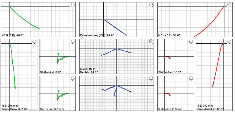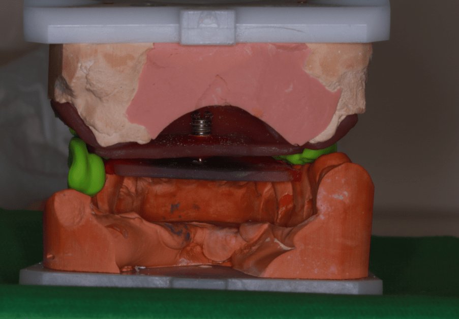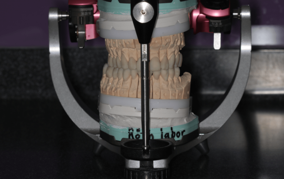 Majd ezt követően arcívvel meghatároztam a felső állcsont koponyához való elhelyezkedését, intraorális rajzolóeszközzel a felső és az alsó állcsont egymáshoz való viszonyát, majd az Arcus Digma készülékkel az individuális mozgáspályákat. Ez mind szükséges ahhoz, hogy egyedi, az egyén számára legkényelmesebb fogpótlás elkészülhessen, melytől jelen esetben páciensünk panaszainak rendeződését vártam.