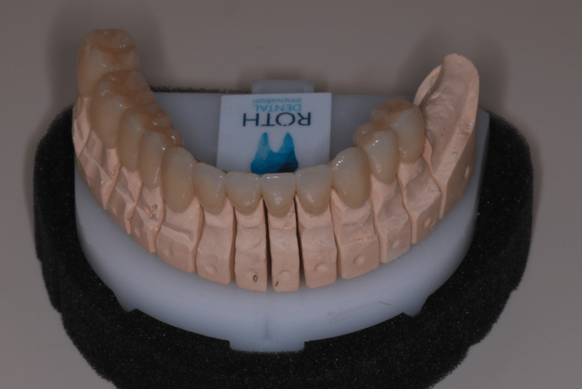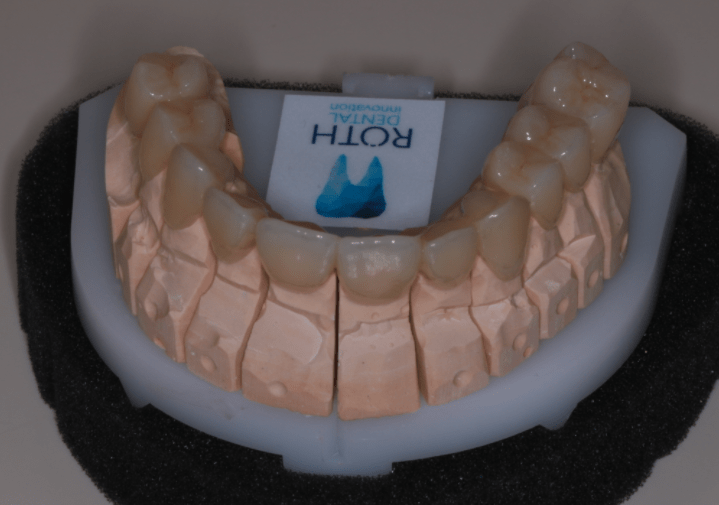 Miután a pácienssel megbizonyosodtunk a pótlás funkcionalitásának sikerességéről, készre kértük a fogtechnikai laborból azt a cirkóniumpótlást, amely a kisebb korrekciókon átesett ideiglenes pótlás tökéletesen pontos mása lett.
