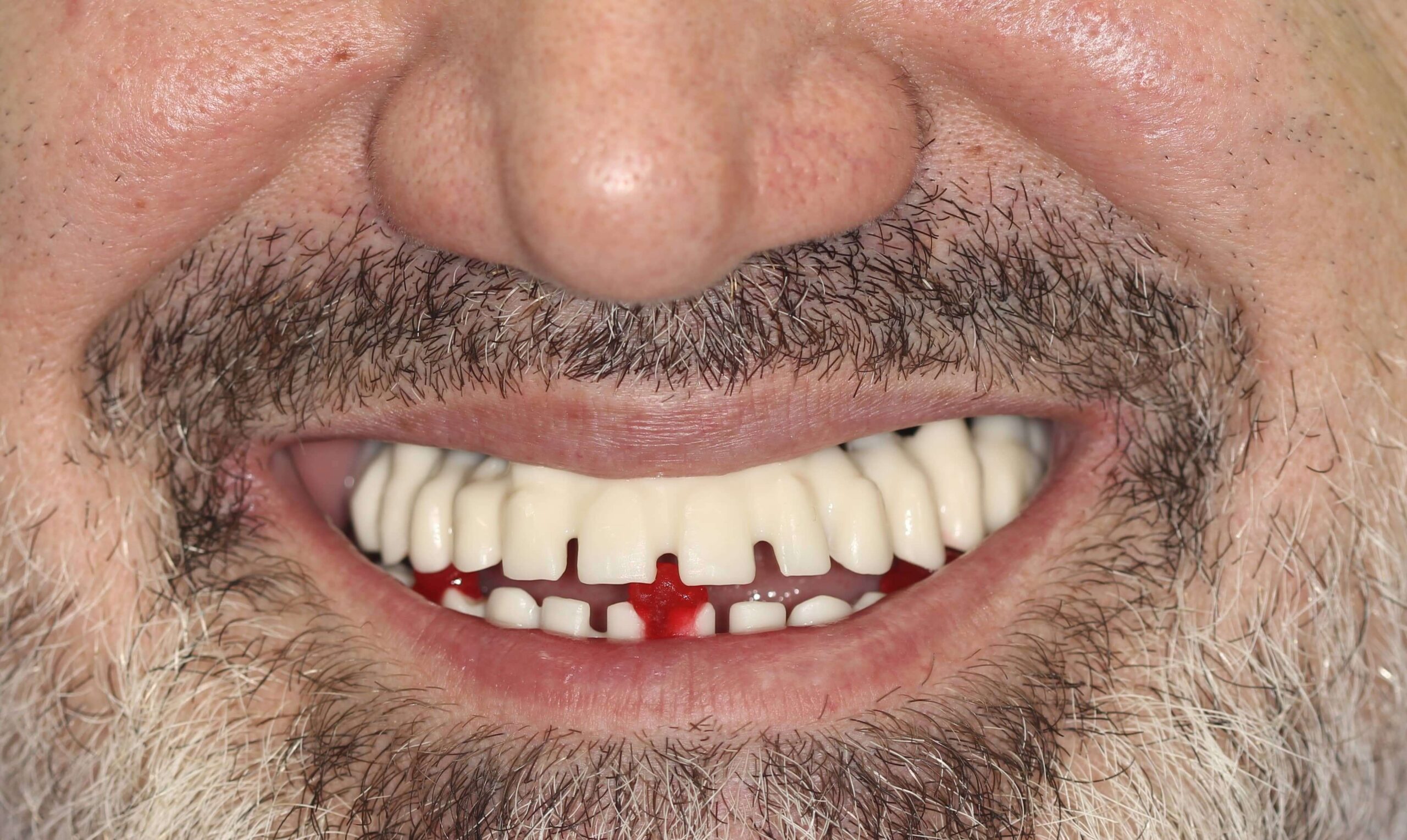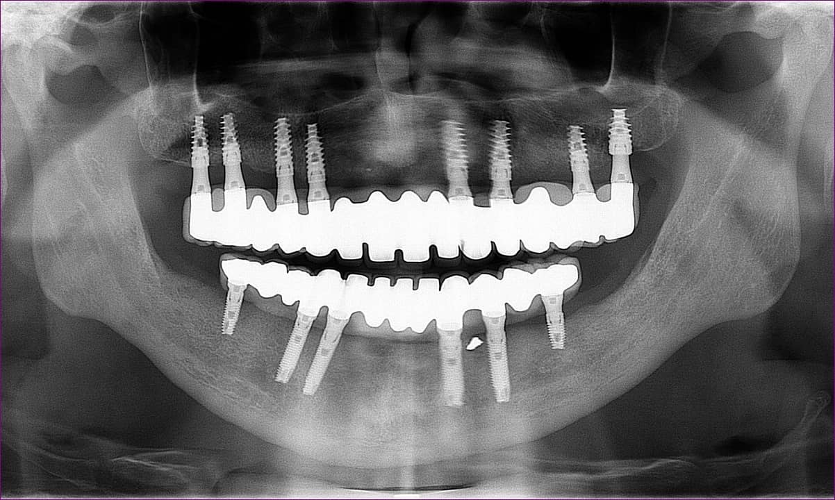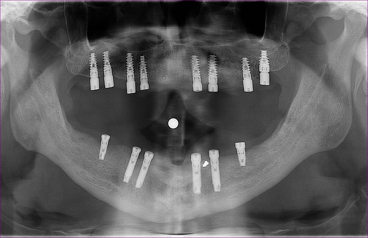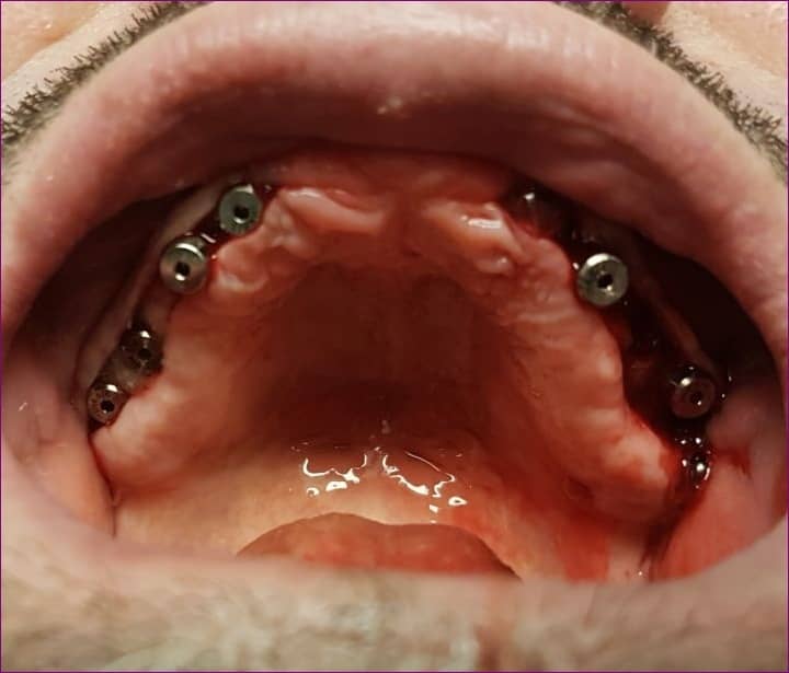 Kezelését dr. Záhonyi Balázs kollégánk végezte. A páciensnek felül 8, alul 6 implantátum került előzőleg beültetésre, az implantátumokba pedig ún. gyógyulási csavarokat helyeztek.