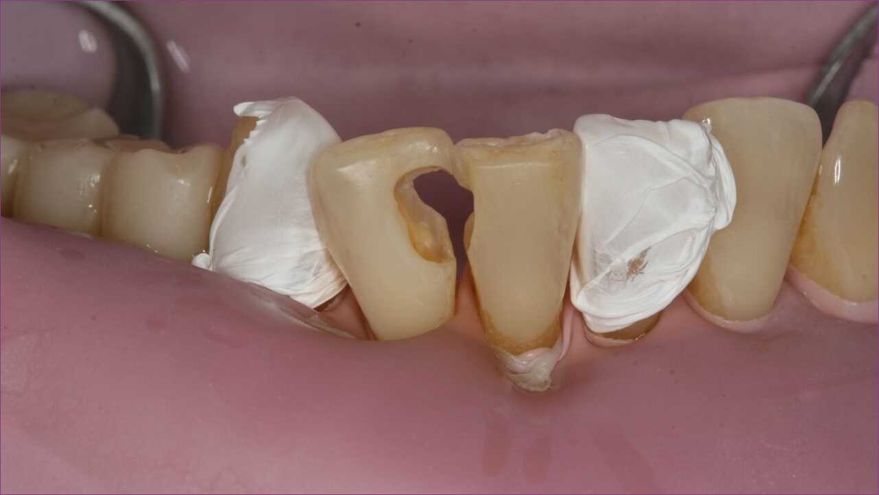 Páciensünk, egy kedves, mosolygós középkorú hölgy arra kért minket, hogy alsó frontfogain keletkezett fogszuvasodást orvosoljuk, mégpedig úgy, hogy a végeredmény ne legyen szembetűnő.
