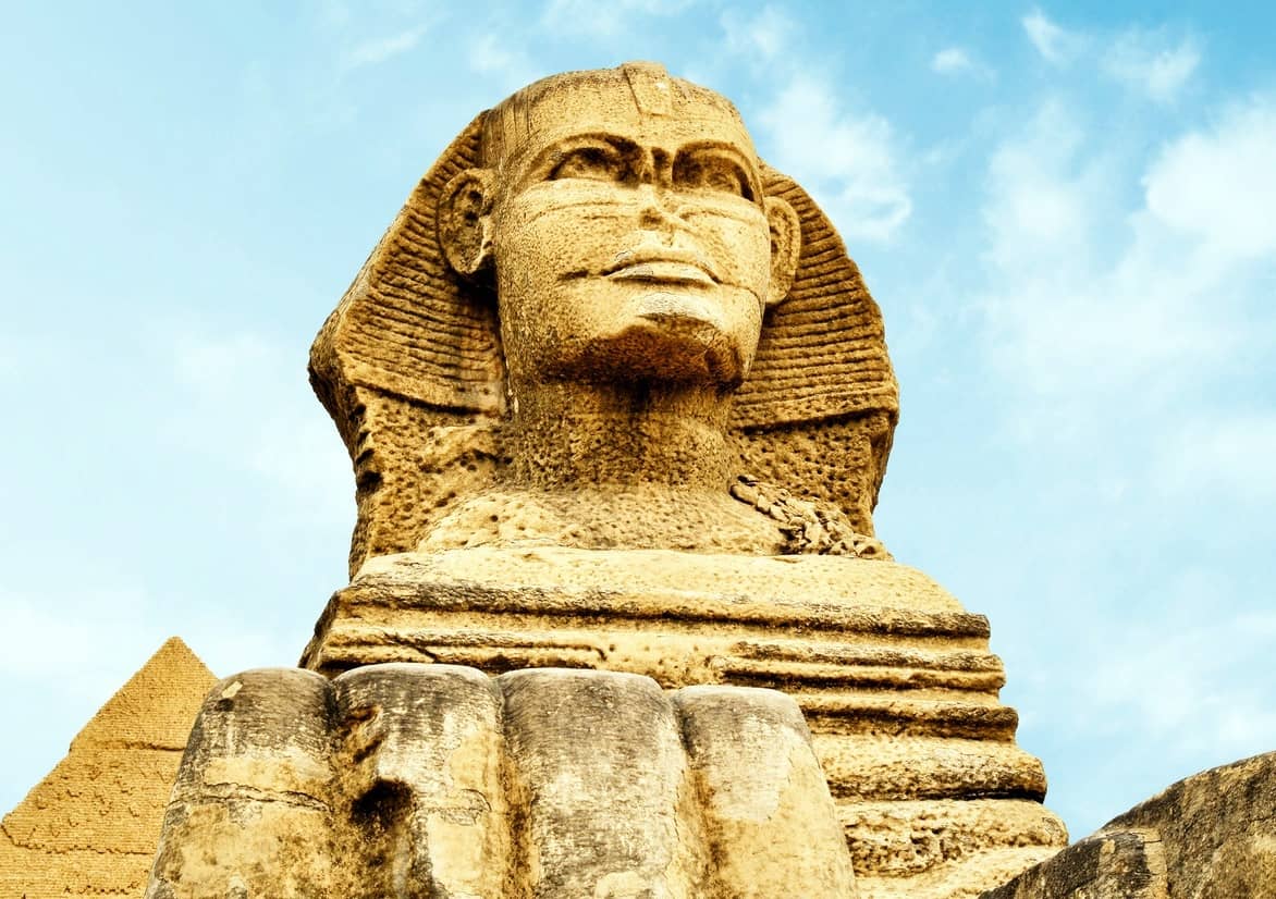 A gízai piramisok mellett fekvő szfinxszobor arca erősen megrongálódott az idők során: az erózió és az emberi rongálás egyaránt nyomot hagyott rajta. Az orrát például a 15. századi feljegyzések szerint szándékosan törték le. De még ezen az erősen megviselt arcon is átsugárzik egy rejtélyes, halvány mosoly.