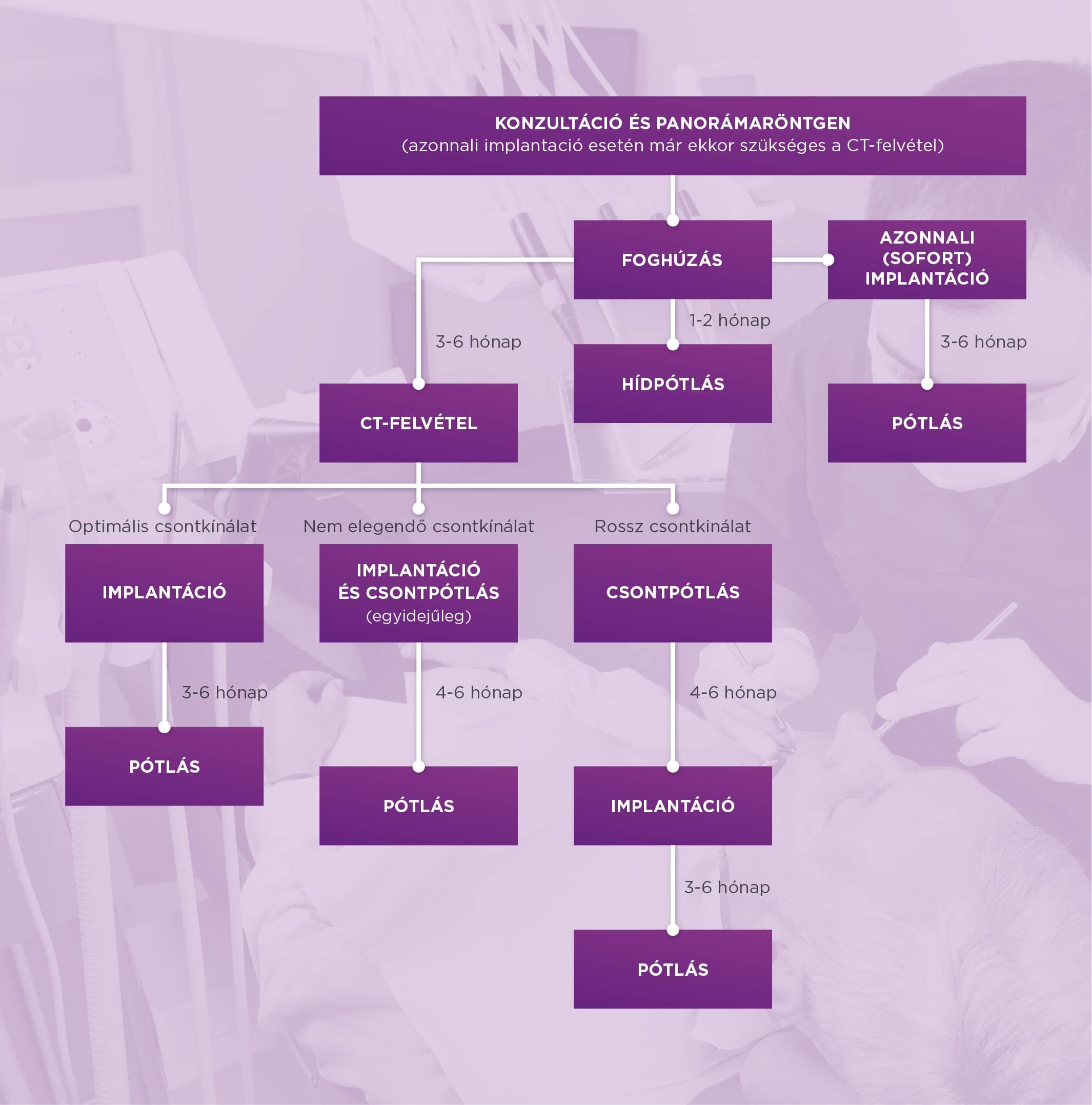 • Állapotfelmérés Az implantáció egy teljes körű állapotfelméréssel, szájüregi vizsgálatottal, háromdimenziós CT-felvétellel kezdődik, amelyet szükség esetén dentálhigiéniai kezelés, fogkő-eltávolítás követ.