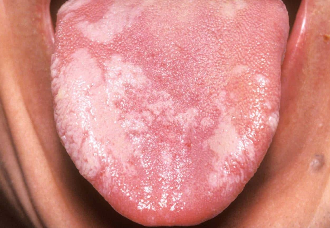 „gombás nyelv” tünete, hogy a nyelv piros, és a fehér lepedék leválik róla.