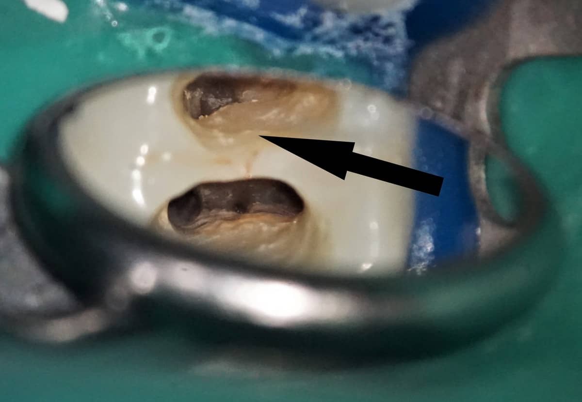 Hosszú távon azonban a tető eltávolítása a fog töréséhez, adott esetben korai elvesztéséhez vezethet (fenti kép).