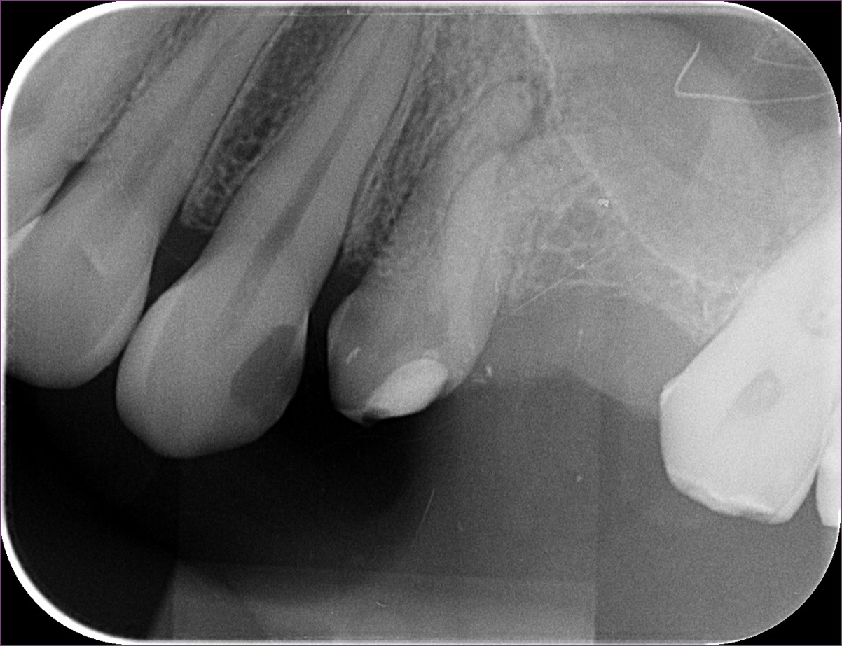 Ezen az utolsó képen látható a fog kontrollfelvétele. A gyökértömést követően a fogat üvegszálas-csapos megerősítéssel láttuk el, majd a gyökérkezelés menete az utolsó fázisához ért: a kezelőorvos beragasztotta az elkészült fogászati hidat.