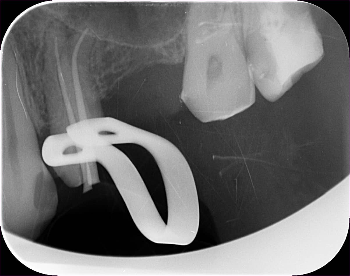 (A szalagszerű képlet a kofferdam-kapocs árnyéka.)