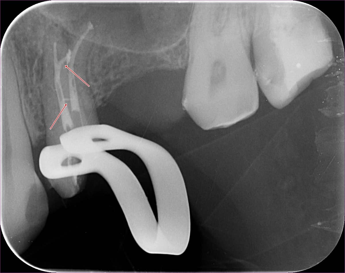 A felvételen egyenesebbnek látszó gyökérben rövidebbnek tűnik a hossz a röntgenen látható véghez képest, azonban itt nem a gyökércsúcson van a kijárat, hanem a gyökér oldalán.