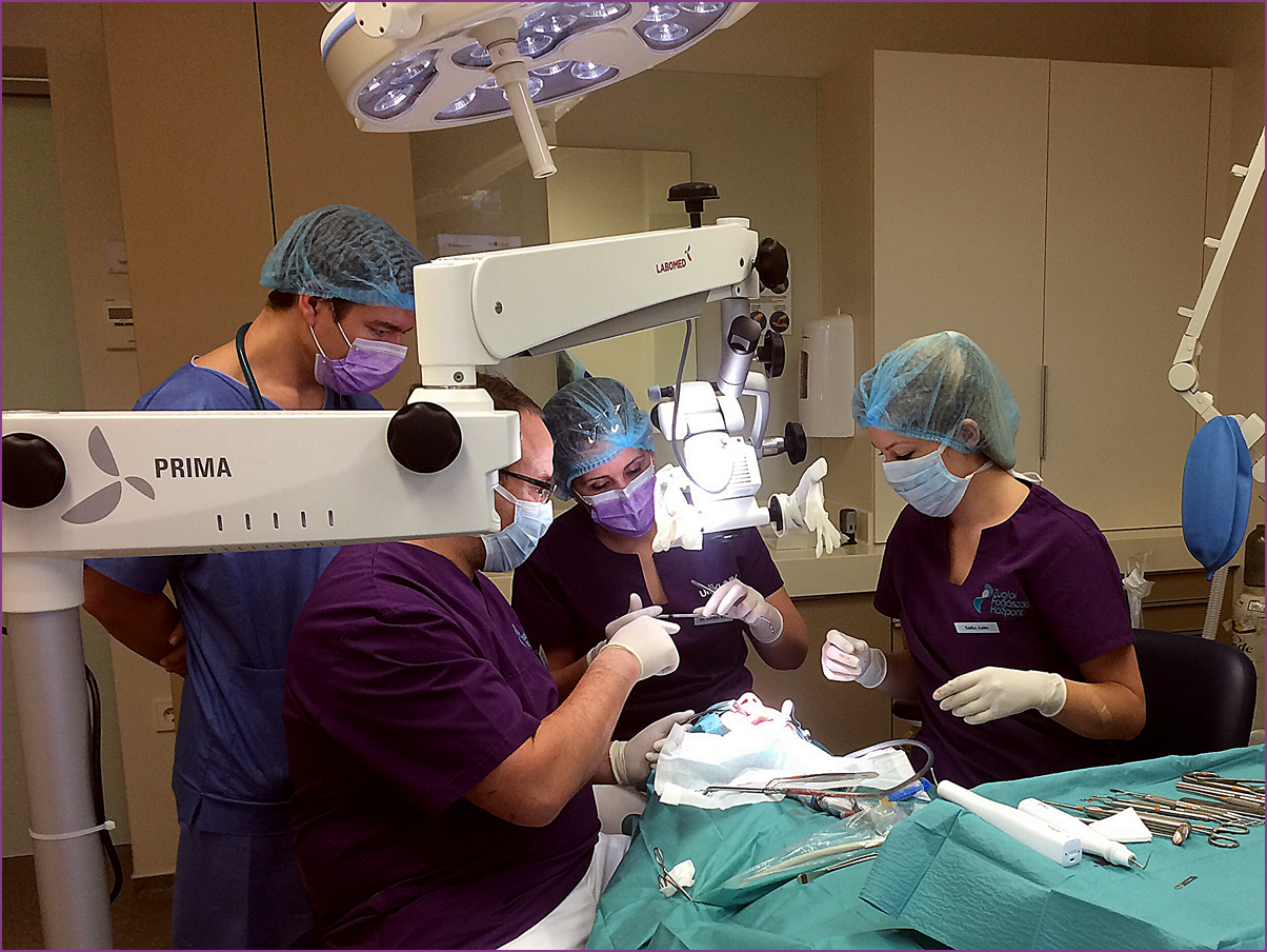 Első alkalommal a gyökérkezelésekre került sor a műtétet megelőző napon. Elvégeztük a jobb felső egyes, hármas, illetve négyes fog mikroszkópos gyökérkezelését. A kettes fog ellátását annak állapota miatt a műtét közben terveztük. Az altatásra, illetve a ciszta eltávolítására, a gyökércsúcsok úgynevezett rezekálására másnap került sor. Dr. dr. Sass Tamás először eltávolította az elváltozást, az érintett, fertőzött gyökércsúcsokat, majd a beavatkozás végén dr. Kovács Kitti elvégezte a kettes fog gyökértömését, szintén operációs mikroszkópban. Az eltávolított cisztát természetesen szövettani vizsgálatra küldtük. A műtéti terület zárása és az ébresztés után páciensünk családi körben, egy erre a célra berendezett megfigyelő szobában pihenhette ki a műtét utáni fáradalmait.