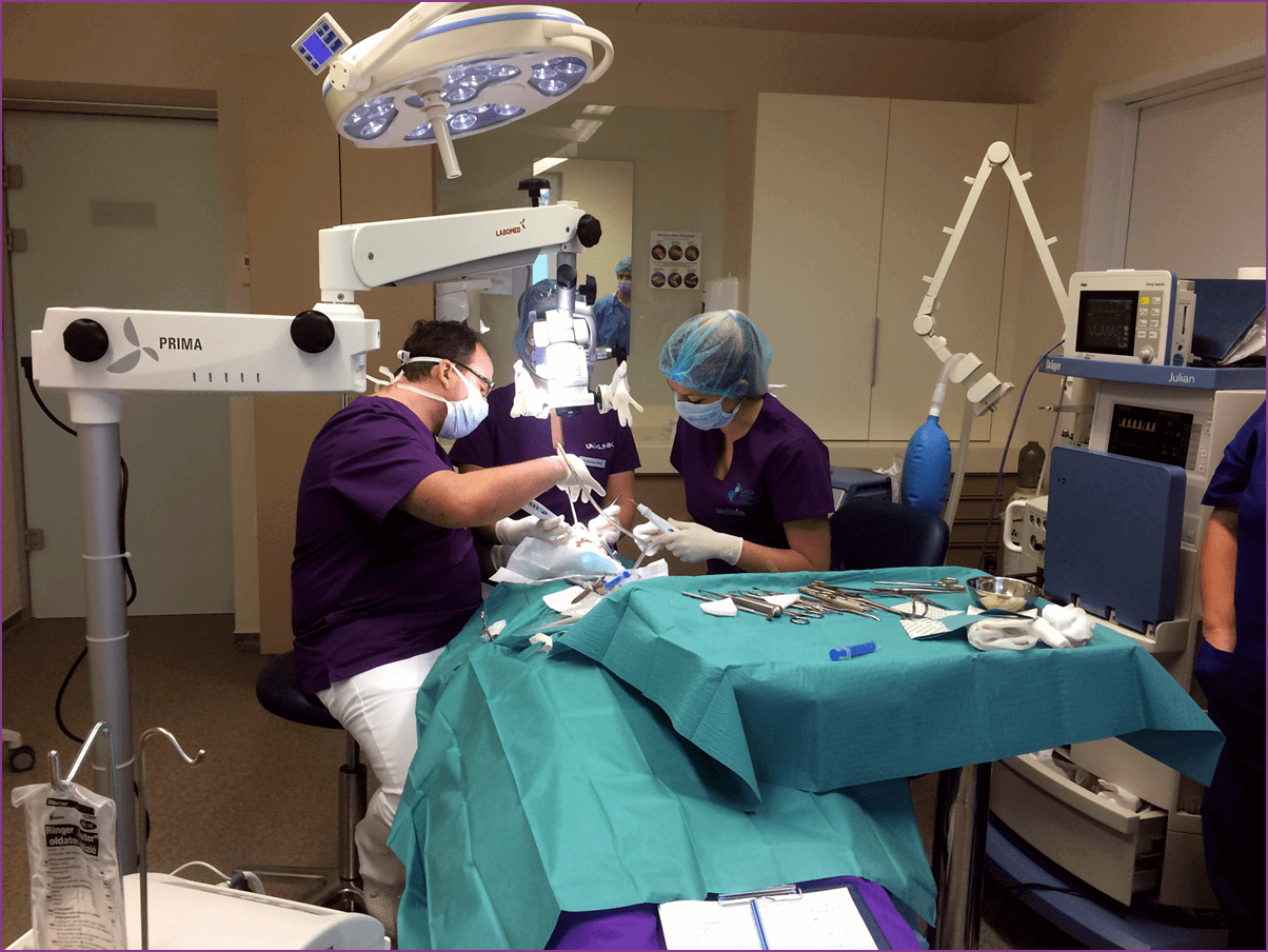 Első alkalommal a gyökérkezelésekre került sor a műtétet megelőző napon. Elvégeztük a jobb felső egyes, hármas, illetve négyes fog mikroszkópos gyökérkezelését. A kettes fog ellátását annak állapota miatt a műtét közben terveztük. Az altatásra, illetve a ciszta eltávolítására, a gyökércsúcsok úgynevezett rezekálására másnap került sor. Dr. dr. Sass Tamás először eltávolította az elváltozást, az érintett, fertőzött gyökércsúcsokat, majd a beavatkozás végén dr. Kovács Kitti elvégezte a kettes fog gyökértömését, szintén operációs mikroszkópban. Az eltávolított cisztát természetesen szövettani vizsgálatra küldtük. A műtéti terület zárása és az ébresztés után páciensünk családi körben, egy erre a célra berendezett megfigyelő szobában pihenhette ki a műtét utáni fáradalmait.