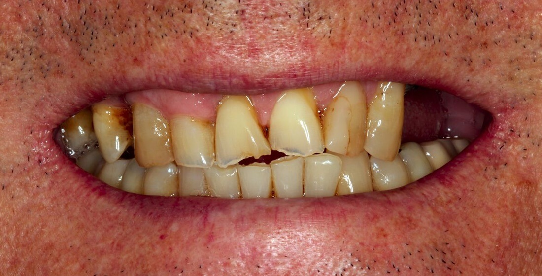 A bal oldalon hiányoztak a páciens kis-és nagyőrlői, a jobb oldalon viszont ún. sorközi foghiányai voltak (ilyenkor fogak határolják elölről és hátulról is a foghiányt). A fogak esztétikáján rontott a fogkő, az elszíneződött régi tömések és a kezdődő saverózió miatti egyenetlen fogélek.
