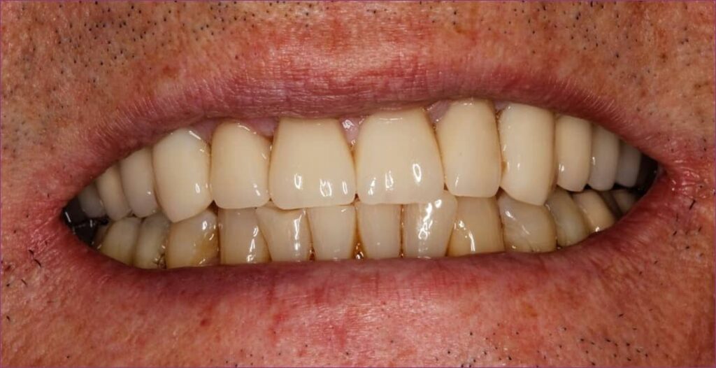 A kezeléssorozatot azzal kezdtük, hogy eltávolítottuk az összes fogkövet, elszíneződést mind a felső, mind az alsó fogakról. A felső állcsont bal oldali őrlőrégiójában implantátumokra rögzített híddal pótoltuk a hiányzó fogakat. A jobb oldalon saját fogakon elhorgonyzott hídpótlást kapott a páciens. Az elülső fogakra (frontrégió) az elérhető legmagasabb esztétikájú préskerámia (eMax) szólókoronákat rögzítettünk. Páciensünk félévente jár fogorvosi kontrollra és professzionális dentálhigiénés kezelésre. A megbeszélt és elsajátított fogmosási módszereket alkalmazva a kezelések végeredményeként kapott pótlásai hosszú távon esztétikailag és funkcionálisan is kifogástalanok, páciensünk legnagyobb örömére és megelégedettségére.