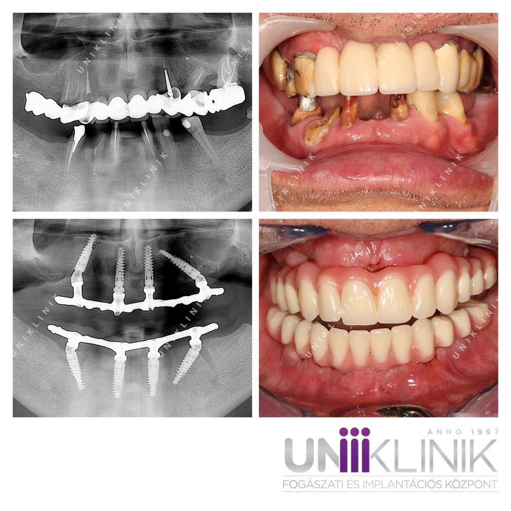 Dr. Jancsecz Péter, dentoalveolaris szájsebész szakorvos, a szájvizsgálat és a CT felvétel kiértékelését követően az All-on-4 rögzített fogpótlást javasolta páciensünknek, mivel a még meglévő fogak és csonkok állapota már nem tette lehetővé a saját fogakra épített hídprotézis elkészítését. Szerencsére a páciens csontállománya megfelelő volt a foghúzásokkal egyidejű implantációhoz, illetve az implantátumok azonnali terheléséhez egy rögzített, ideiglenes fogpótlással. Az All-on-4 implantációs technológiával állcsontonkén 4-4 implantátum behelyezésével fix, rögzített ideiglenes fogpótlás készíthető, akár közvetlenül a műtétet követően.