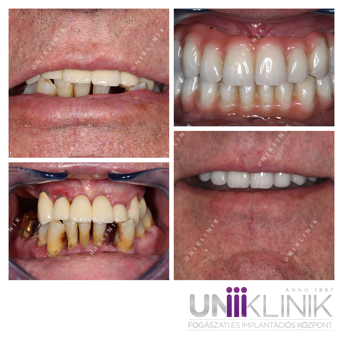 68 éves páciensünk a hiányzó rágófogait szerette volna pótolni, valamint meglévő fogai és régi hídja mobilitása miatt keresett fel minket.
