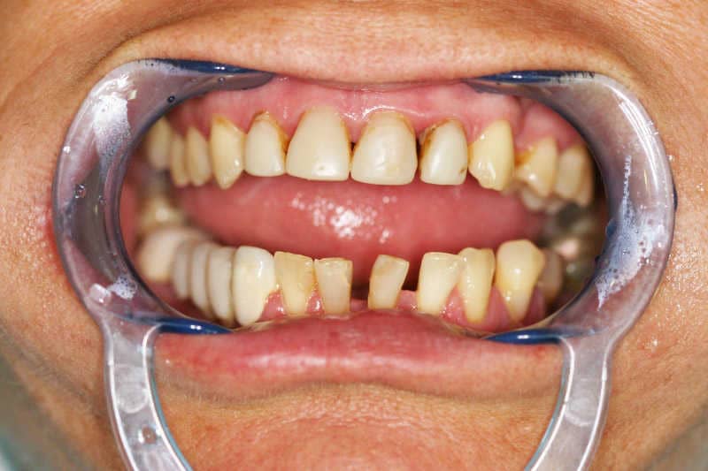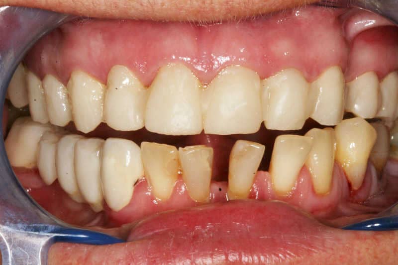 A magas pozíciót betöltő, igényes nőpáciensünk fogsorát esztétikai és funkcionális szempontból rendezni kellett. Kiindulási állapot: régi, elkopott, alászuvasodott tömésekkel és fogpótlásokkal teli fogsor.
