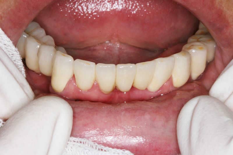 Az alsó fogsor rehabilitációjához két NobelActive implantátum behelyezését végeztük el a jobb oldalsó régióban. Fogeltávolításra nem volt szükség. A Procera cirkonkoronák itt is kielégítették a maximális esztétikai és fogászati igényeket.