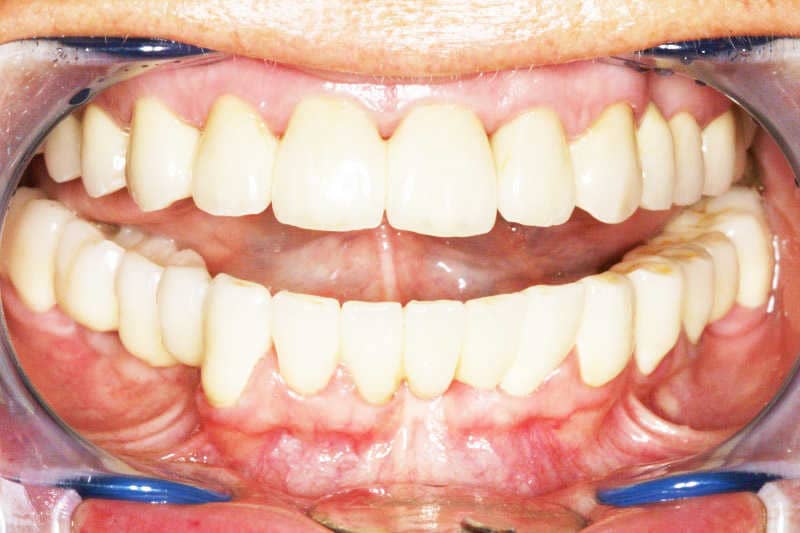Rögzítettük a végleges felső Procera cirkonkoronákat. Jól megfigyelhető a lényeges esztétikai különbség az alsó és a felső fogsor között, a funkcionalitásról nem is beszélve!