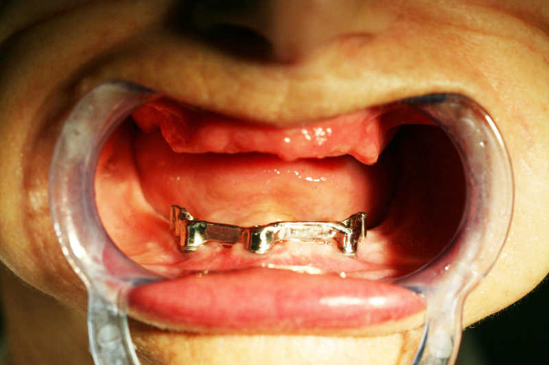 3 db NobelBiocare implantátumot ültettünk be az alsó fronttájékra. 3 hónap csontosodást követően egy csavarokkal elhorgonyzott, aranyötvözetből elkészített stéget és rajta rejtett finommechanikai rögzítőelemekkel („rejtett patentokkal”) kapaszkodó fémlemezes kivehető pótlást készítettünk.