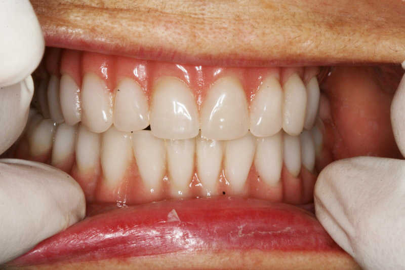 Ez a pótlás mind esztétikai, mind funkcionális szempontból felveszi a versenyt a teljesen fix porcelánleplezésű hidakkal. Felül egy műanyag alaplemezű, kivehető fogsort készítettünk. A műfogak alul-felül Ivoclar gyártmányúak (made in Liechtenstein).