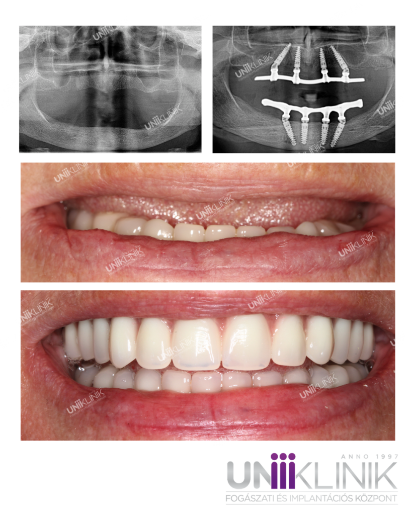Ennek első lépéseként alul 4 db implantátumot, illetve azokba ún. felépítményeket (az implantátumokat és a fogpótlást összekötő közti elem) helyeztünk, amelyekről már műtét közben lenyomatot vettünk. Ezen alsó műtét folyamán eltávolítottuk a jobb felső 4-es gyökérmaradványt, előkészítve az állcsontot a későbbre tervezett felső implantációhoz. A műtét után 3 nappal fogpróbát tartottunk, amikor is ellenőriztük a harapási pozíciót és a fogszínt, fogformát és fogfelállítást. A műtét napja után 1 héttel eltávolítottuk a varratokat és átadtuk -az eddig nem nagy sikerrel hordott kivehető protézist lecserélve- az esztétikus és FIX fogpótlást, ami egy ún. “hídprotézis”, egy speciális rögzített hídpótlás: egy fém váz -az orvos által a későbbiekben bontható módon- csavarokkal rögzül az implantátum felépítményeken és a német prémium műfogakat gyártó IVOCLAR cég műfogait polimerizálják rózsaszín műínybe, ami az összeköttetést jelent a fém váz és a fogak között. A páciens könnyes szemmel üdvözölte a végre fix és esztétikus fogait!