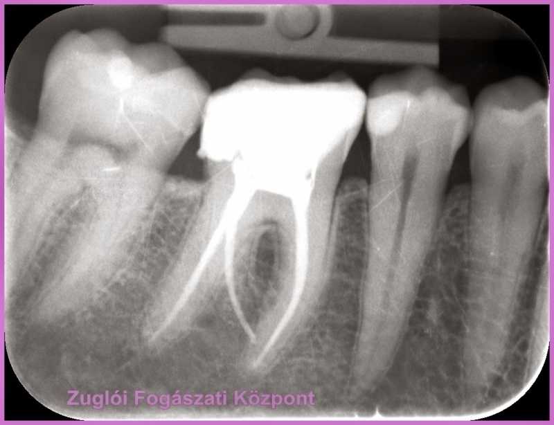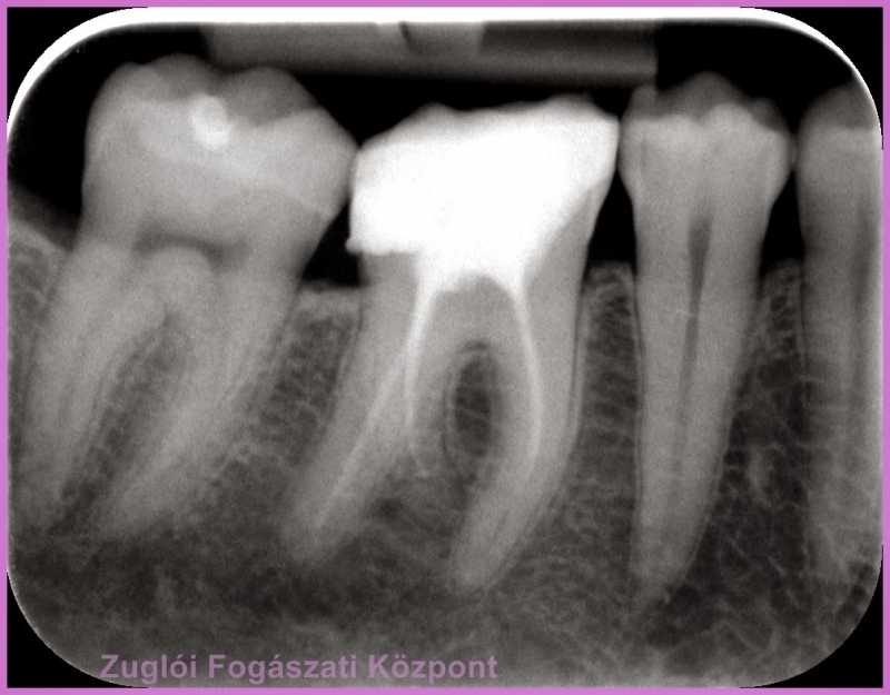 Kolléganőnk kicserélte a gyökértömést, ezen a röntgenfelvételen a kezelés utáni állapot látszik.