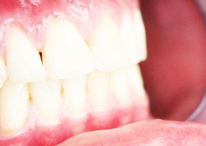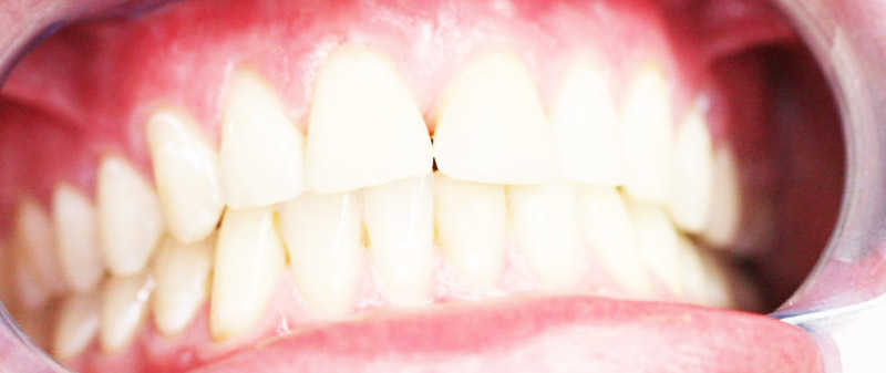Jól látható a páciens elülső fogain az elszíneződött zománc és a két nagymetsző közötti hézag- diasthema.
