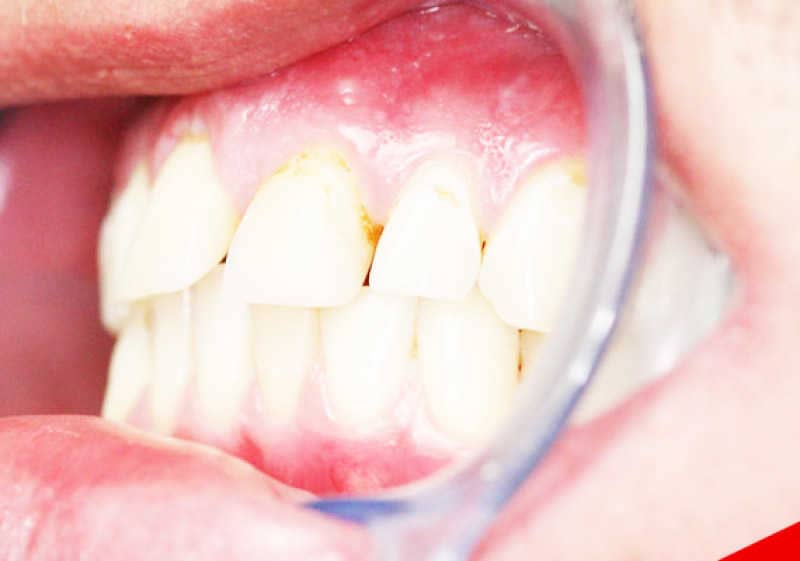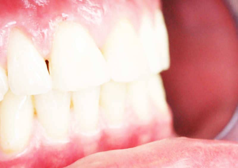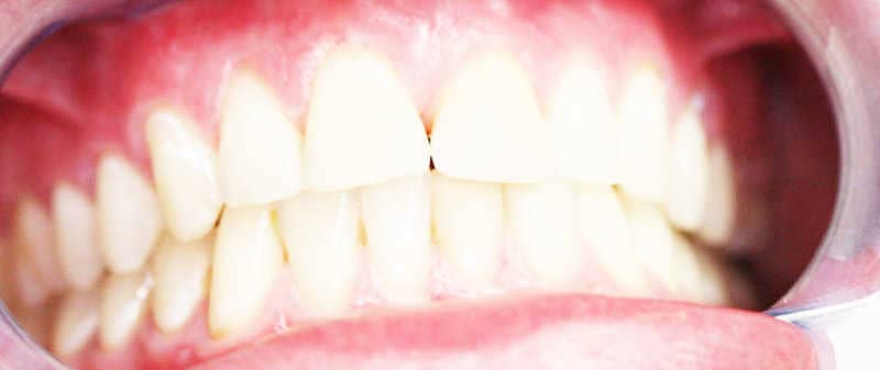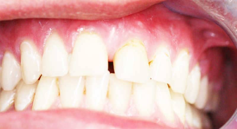 Jól látható a páciens elülső fogain az elszíneződött zománc és a két nagymetsző közötti hézag- diasthema.