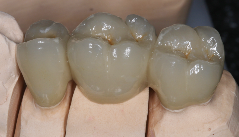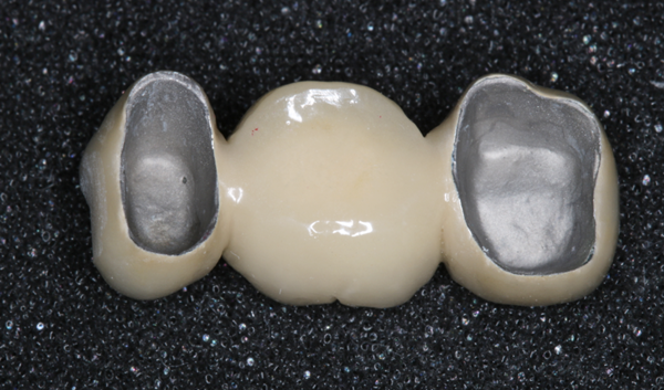 Dr. Sápi Béla páciense a hiányzó jobb felső első nagyőrlőjét szerette volna pótoltatni, és a szakvéleményt figyelembe véve a hídpótlás mellett döntött. A fémkerámia pótlások esetében egy belső kobalt-króm ötvözet adja a belső, merev vázat, amely cementtel rögzül a fogra (vagy a fogakra), és erre kerül ráégetéssel az esztétikus, fogszínű kerámia. A fémkerámia pótlás előnye, hogy költségkímélőbb a többi pótlással szemben, és ezzel a hagyományos módszerrel is tartós és esztétikailag kielégítő pótlások készíthetőek.