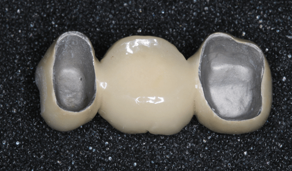 Jól megfigyelhető a belső kobalt-króm váz és a rajta elhelyezkedő kerámia leplezés (a leplezés a pótlás külső, látható részét jelenti).