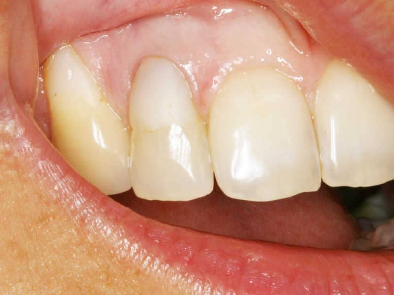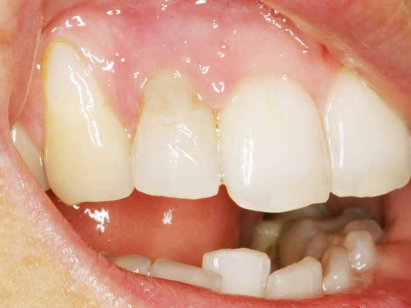 Páciensünk a jobb felső kismetszője körül levő állandó gyulladás, fájdalom, vérzés és rossz esztétikum miatt fordult hozzánk. A szájvizsgálat és a röntgenfelvételeket követően megállapítottuk, hogy a gyökéren külső felszívódás jelei láthatóak. Emiatt sajnos a fogat el kellett távolítani, de ezt azonnali fogpótlás követte.