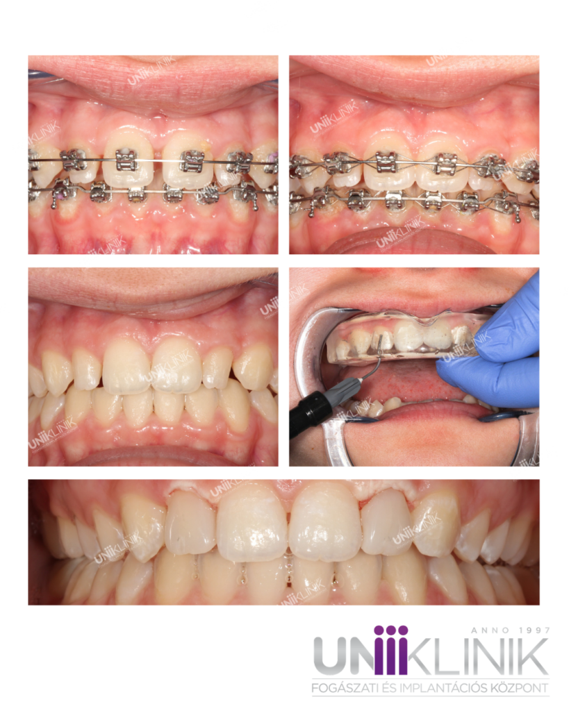 Panoráma és teleröntgen készítése után dr. Suszták Adrienn fogszabályozó szakorvos fém rögzített fogszabályozó készüléket javasolt. Felső kismetsző fogainak esztétikai korrekciójára dr. Balogh Brigitta konzerváló fogászat és fogpótlástan szakorvosa injection moulding technikára készített tervet.