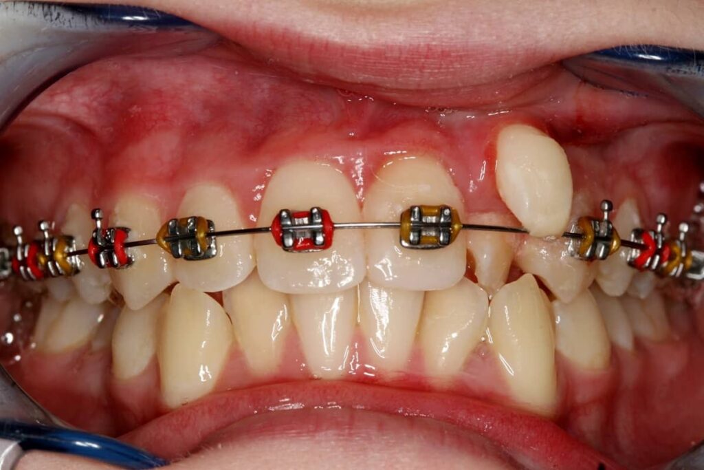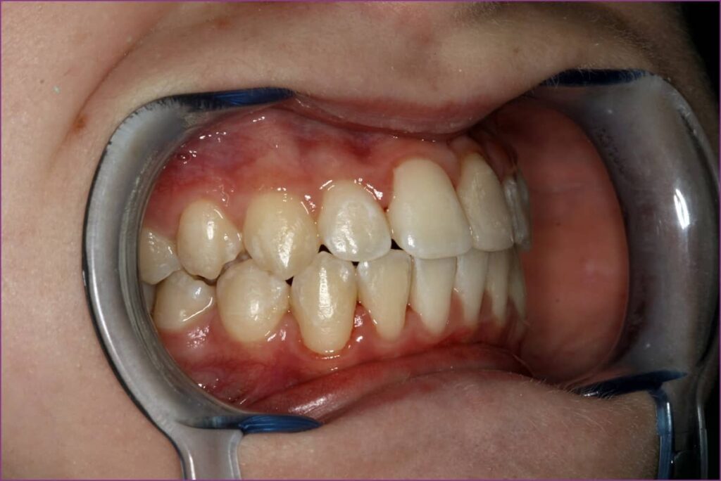 A jobb oldali kismetszők beszabályozásához esedékessé vált az alsó fogszabályzó készülék ragasztása is. A harapás beállítását követően a készüléket eltávolítottuk.