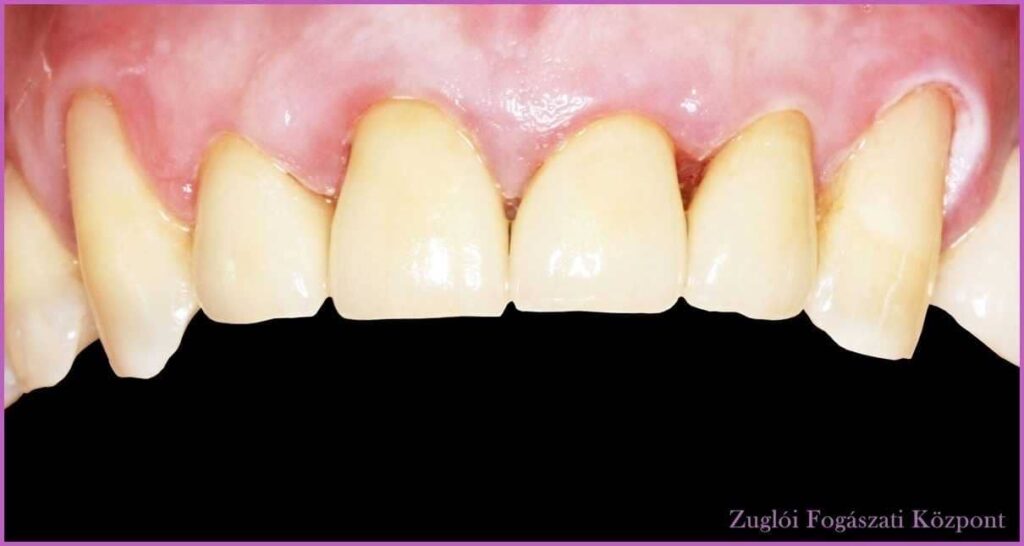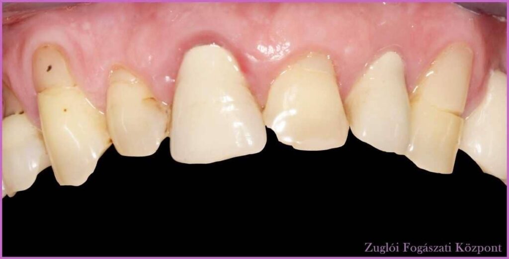 A páciens a frontfogak esztétikájával volt elégedetlen – méghozzá joggal. Kezelőorvosa, Dr. Balogh Brigitta az elszíneződött, hiányos nyaki tömések cseréjét javasolta, valamint a régi fémmentes koronák cseréjét fémmentes Procera cirkónium-dioxid koronákra.