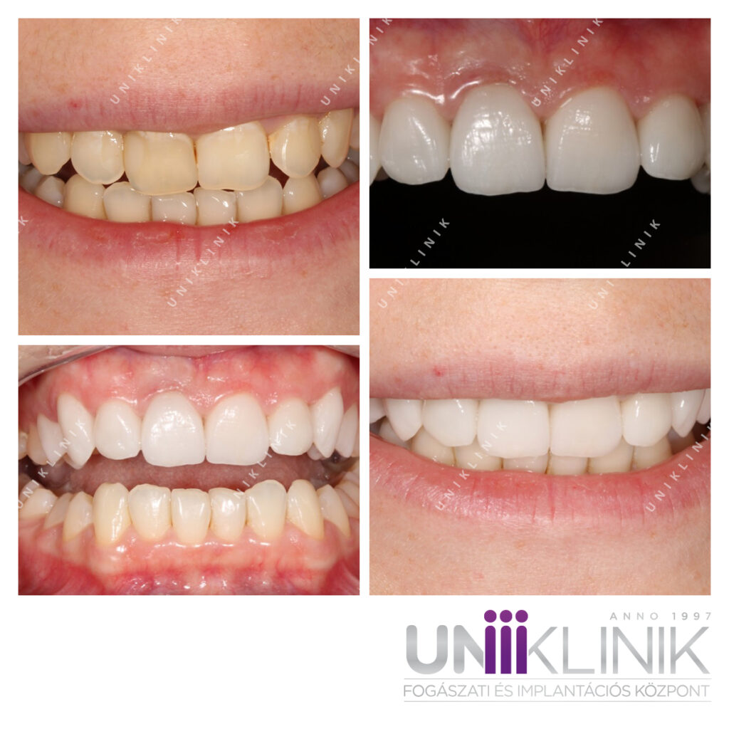 Tervezés illetve kivitelezés során nagy kihívást jelentett, hogy a héjak alatt eltérő színű csonkok találhatóak, azonban összességében nem látszik különbség a restaurátumok színe között. Páciensünk hatalmas örömmel fogadta a végeredményt, nagyon hálás volt, hogy végre újra bátran mer mosolyogni.
