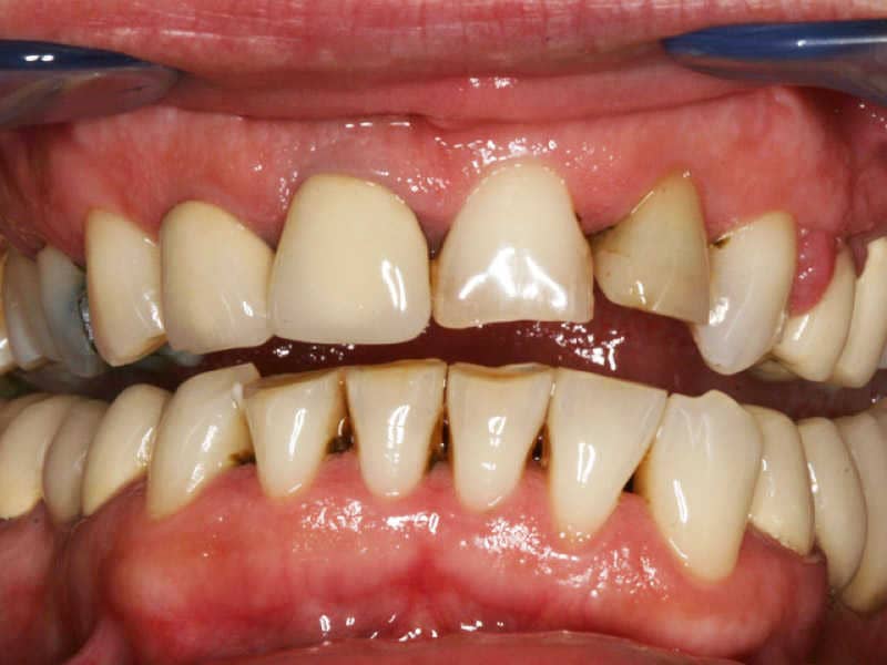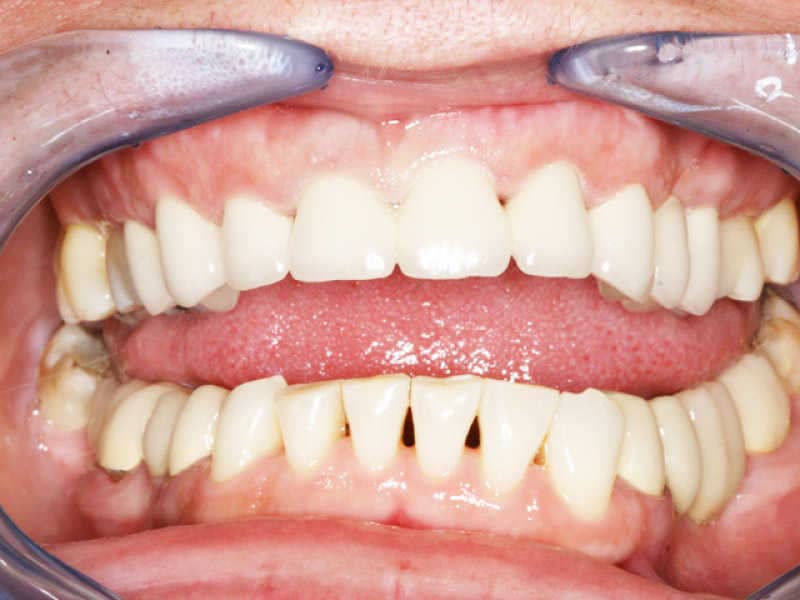 A páciensünk nem igazán esztétikus fogsorának megszépítéséhez a hagyományos fém- és kerámiapótlások cseréjére, valamint fogfehérítésre volt szükség.