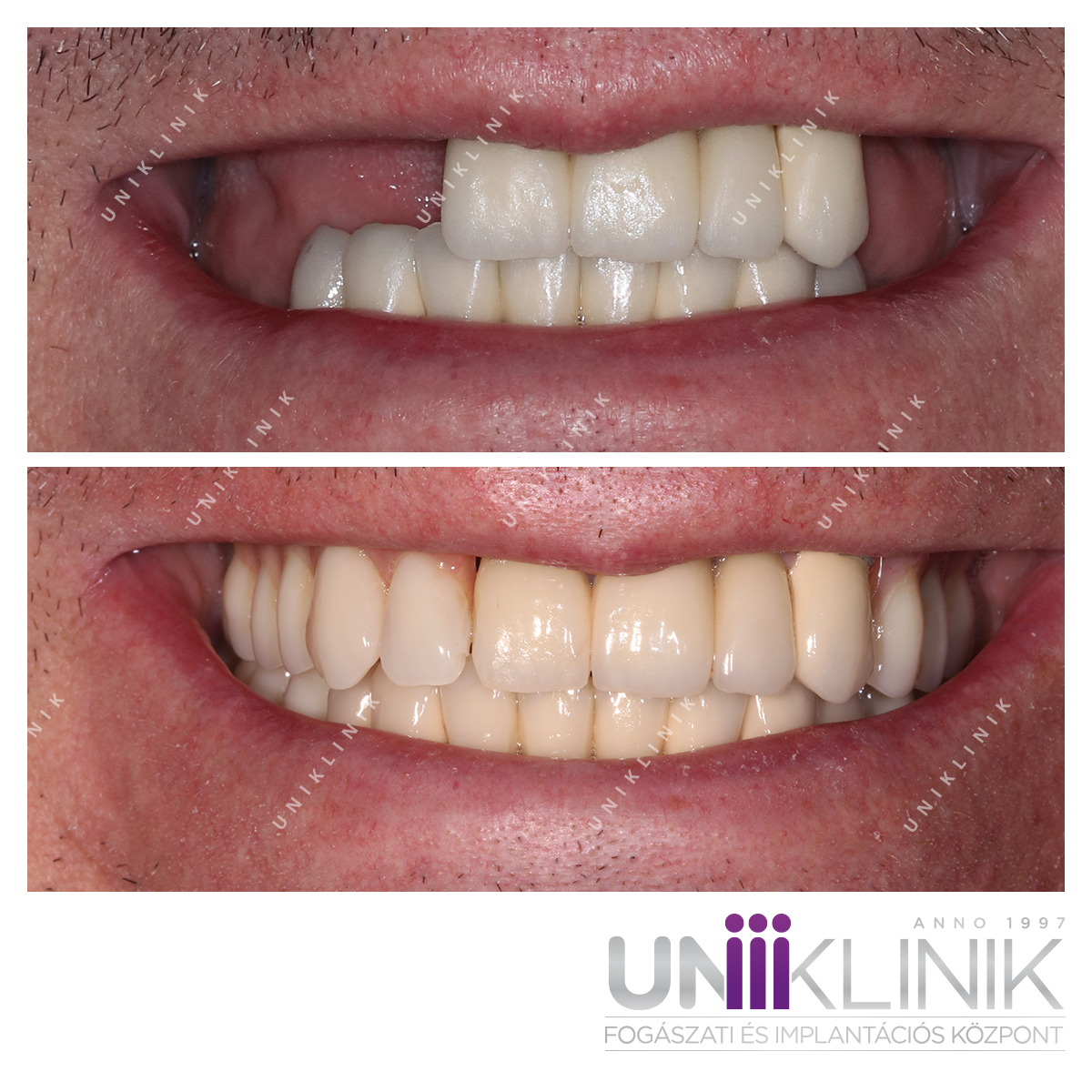 Páciensünk foghiányainak pótlása és az esztétikus megjelenés helyreállítása céljából keresett fel bennünket. Mindezt nagyobb műtéti beavatkozások nélkül szerette volna elérni, továbbá fontos szempont volt az alacsony költség