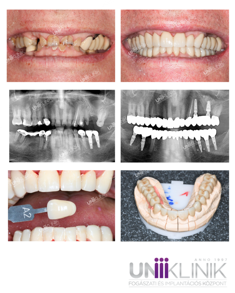 Maximálisan individualizált PMMA, hosszútávú ideiglenes pótlást páciensünk 6 hónapig hordta. Ez idő alatt TMD panaszai teljesen megszűntek, fülzúgása elmúlt. Közben a foghiányai helyére implantátumok kerültek behelyezésre, a végleges pótlást ezekre, illetve a saját fogaira cirkónium-dioxidból készítettük el. Páciensünk legnagyobb megelégedésére funkcionálisan és esztétikailag is számára tökéletes megoldás született.