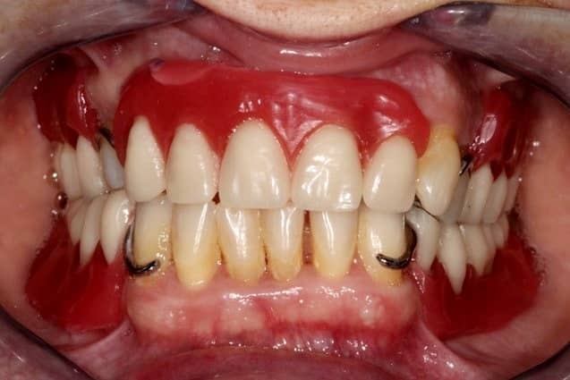 Ezek az öntött kapcsok a pótlás viselésekor sajnos nem túl esztétikusak, ám van, amikor eme hátrány ellenére is ez a fogpótlás jelenti a megoldást. Páciensünk mindenesetre maradéktalanul elégedett volt megújult mosolyával!