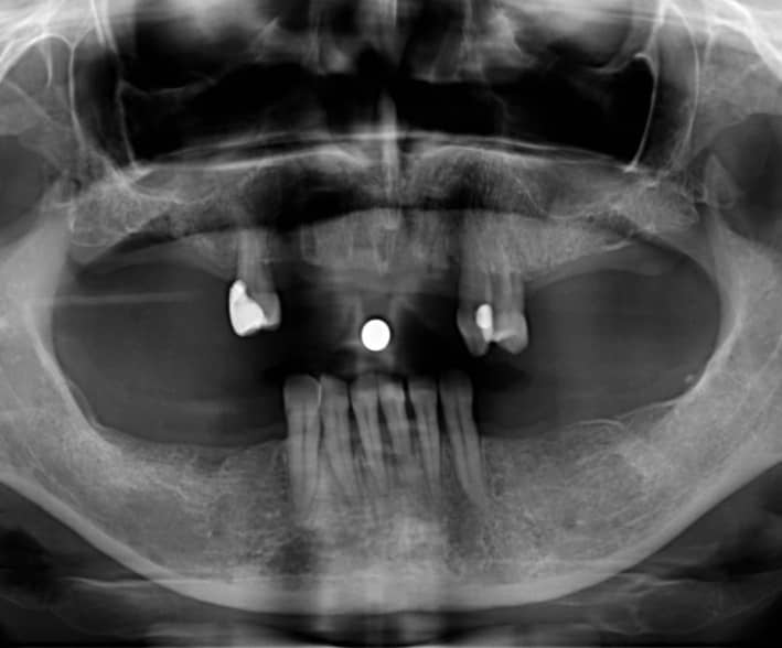A vizsgálatok és röntgenfelvételek birtokában megbeszéltük, milyen lehetőségek jöhetnek szóba. A páciens az implantációt anyagilag nem tudta vállalni, illetve a megmaradt természetes fogait nem szerette volna bármilyen egyéb pótláshoz lecsiszoltatni, így végül az öntött kapcsos, kivehető pótlás mellett döntöttünk.