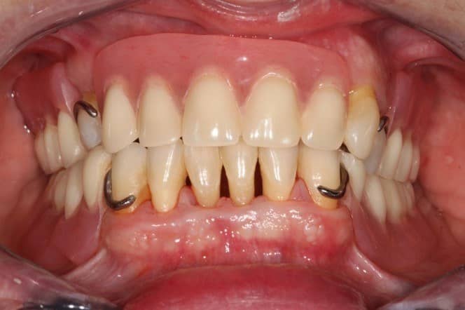 Egy alapos depurálás után mintát vettünk a fogsorról, megtörtént a harapási forma meghatározása és rögzítése. A laborban elkészített próbafogsorral ellenőriztük, hogy a funkciót és az esztétikai követelményeket tekintve is minden megfelelő-e a páciens számára. Miután mindkét fél elégedett volt a próbával, a labortól kértük a fogpótlás véglegesítését.