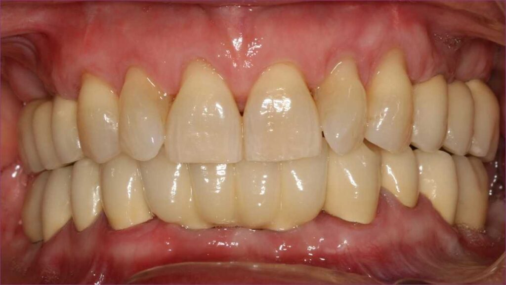 Nőpáciensünk arra panaszkodott, hogy meglévő fogai mozognak, rendszeresen vérzik az ínye, és kellemetlen szagú a lehelete. A szájvizsgálat és a panoráma-röntgenfelvétel alapján egyértelművé vált, hogy panaszok hátterében előrehaladott fogágybetegség áll. A teljes szájrehabilitáció implantátumokkal és fémkerámia koronákkal történt, valamint a pácienst egy dentálhigiénikus kolléganőnk ismertette meg a gyulladásmentes állapot fenntartását célzó fogápolási technikával.