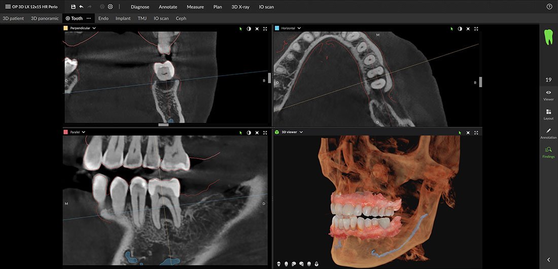 Az OP 3D LX lehetővé teszi a csontszerkezet valamint a sinus és az ideg elhelyezkedésének teljes körű vizsgálatát, biztosítva ezzel a csontvesztés kezelésére szolgáló lehetőségek pontos meghatározását.